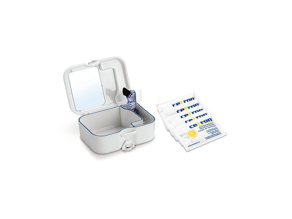 Balenie: súprava CETRON® Care obsahuje čistiacu nádobku, kefku a 5 vrecúšok čistiaceho prášku CETRON® po 15 g